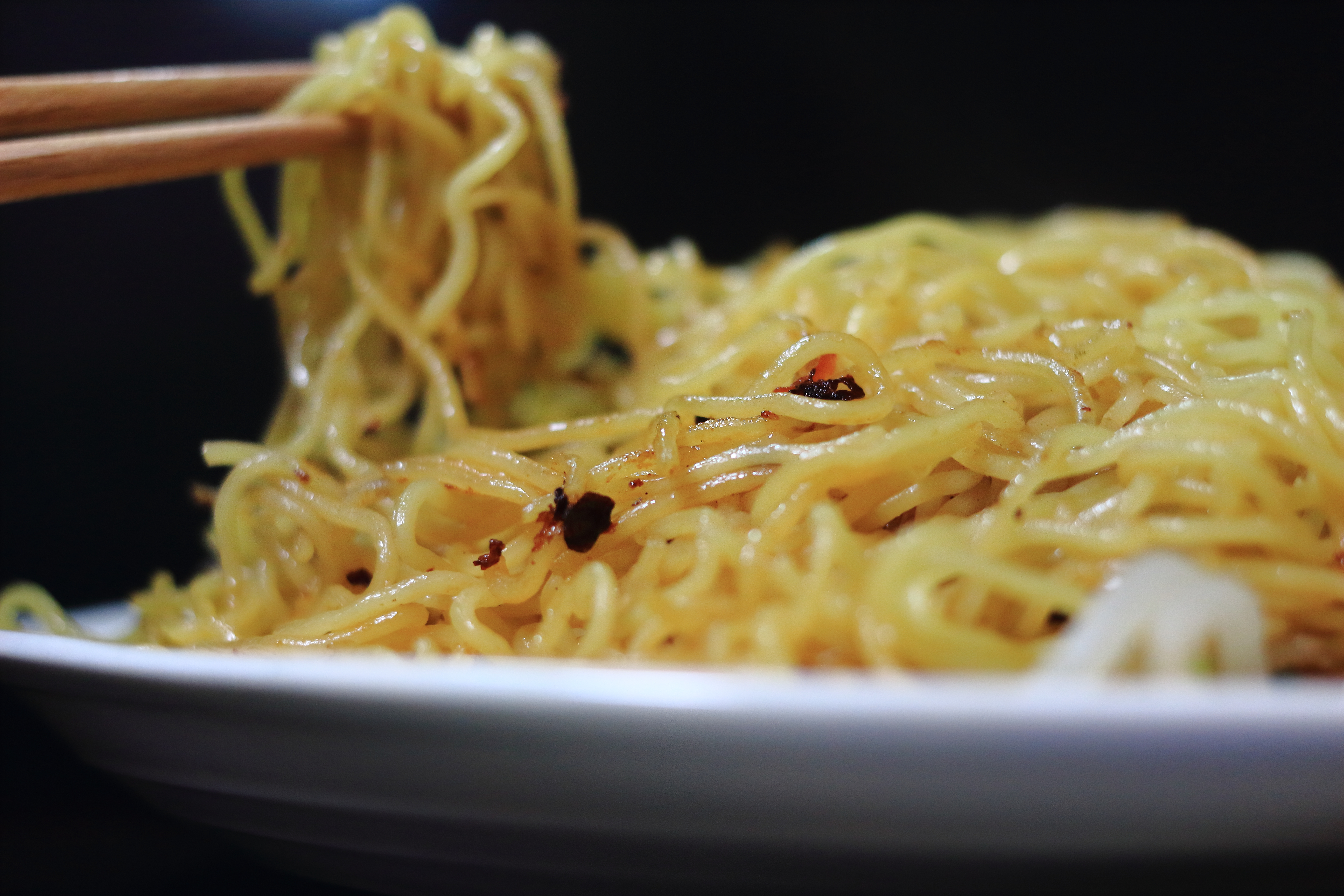 塩焼きそばをマクロで捉えた写真です。箸あげの瞬間が切り取られ、湯気とともに立ち上る香ばしい香りが伝わってきます。焦げ目の付いた麺は質感豊かで、熱々の美味しさを感じさせます。もやしやニラ、にんじん、豚肉といった具材がバランスよく絡み、塩味のすっきりとした味わいが想像できます。黒背景によって料理が際立ち、透明感と遠近感のある印象的な食事シーンを表現しています。