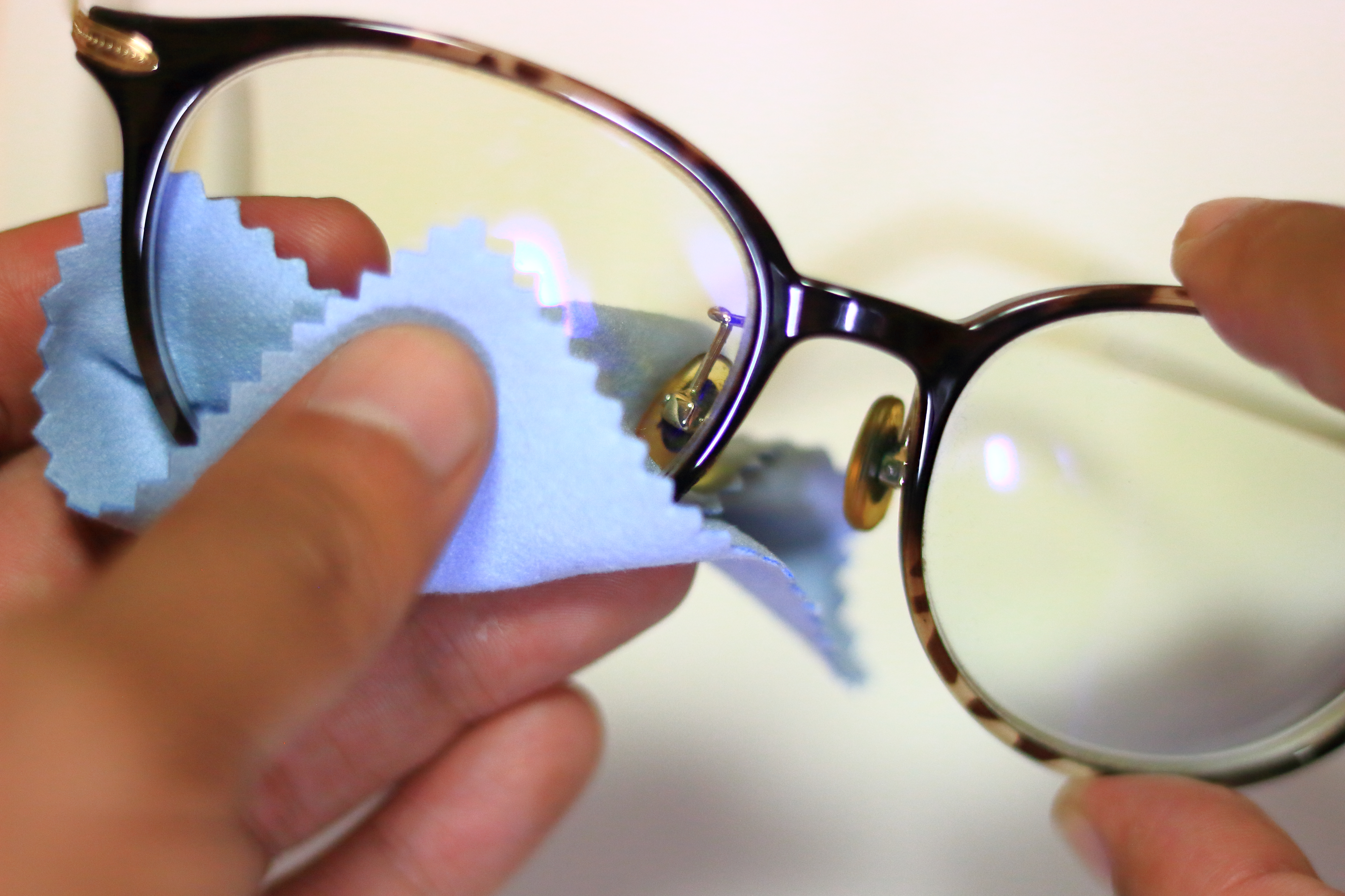 メガネクロスでレンズを丁寧に磨いている様子を写した写真です。日常的な清掃や手入れのひと手間が、愛用品を清潔に保ち、長持ちさせることにつながります。取扱いに気を配る姿勢からは、道具を大切にするライフスタイルが感じられ、落ち着いた実用性のある雰囲気が伝わってきます。日々の習慣の中にある、ささやかな心がけを表現した一枚です。