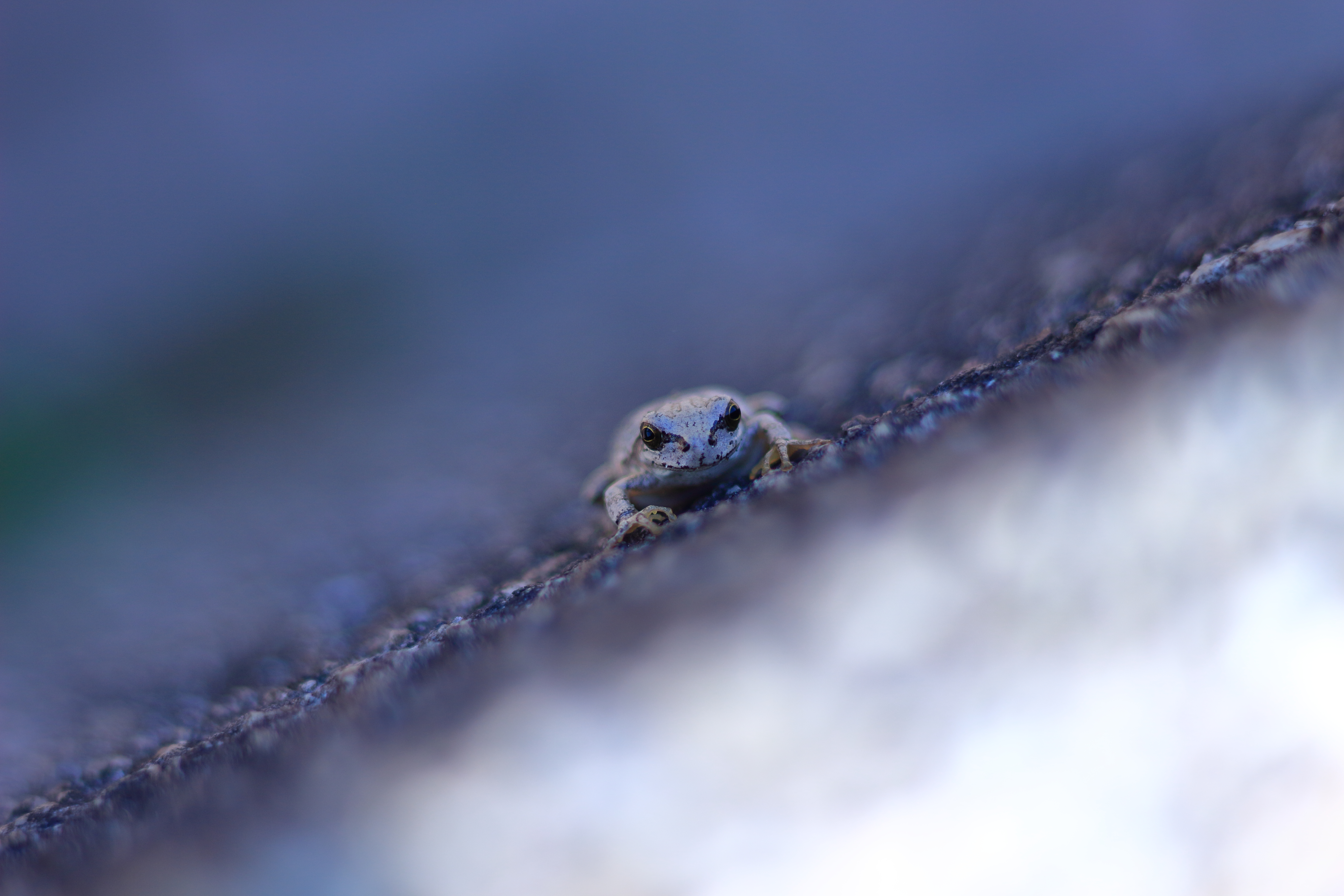 屋外で撮影されたカエルが、まるでロッククライミングをしているかのように登っている瞬間を捉えた写真です。独特なアングルとマクロ撮影によって遠近感が強調され、小さな生物の動きにダイナミックさが加わっています。自然の中で見せるカエルの姿に遊び心を感じさせ、思わず微笑んでしまう一枚です。日常の風景を別の視点で楽しませてくれる印象的な写真です。