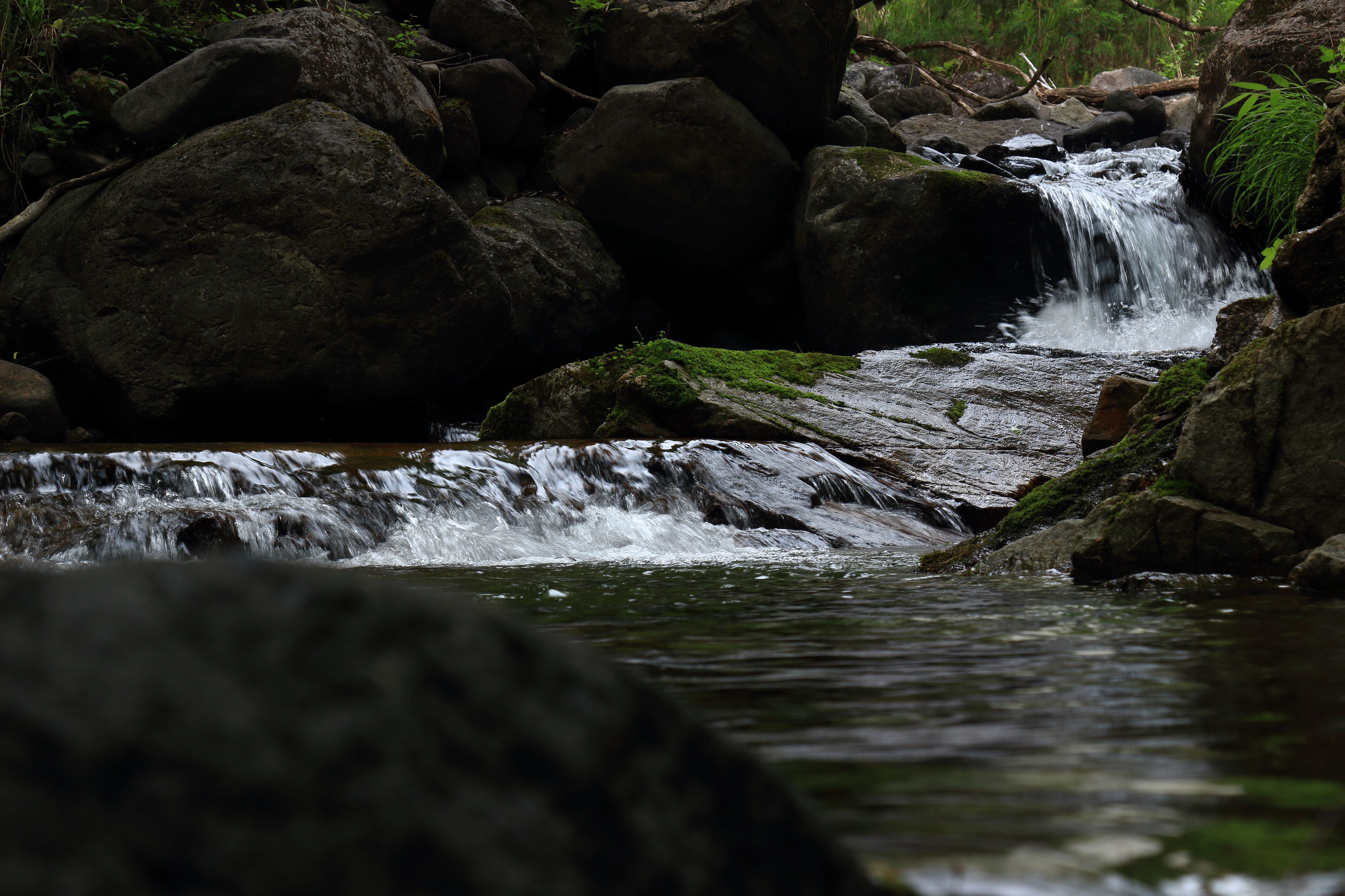 渓流を流れる水が岩に当たり、水しぶきや細かなミストが立ち上る様子を捉えた写真です。澄んだ水流と周囲の緑が調和し、森林浴をしているかのような清々しさを感じさせます。アウトドアやキャンプの合間に立ち寄りたくなる自然の一場面で、静けさと涼感が伝わる一枚です。