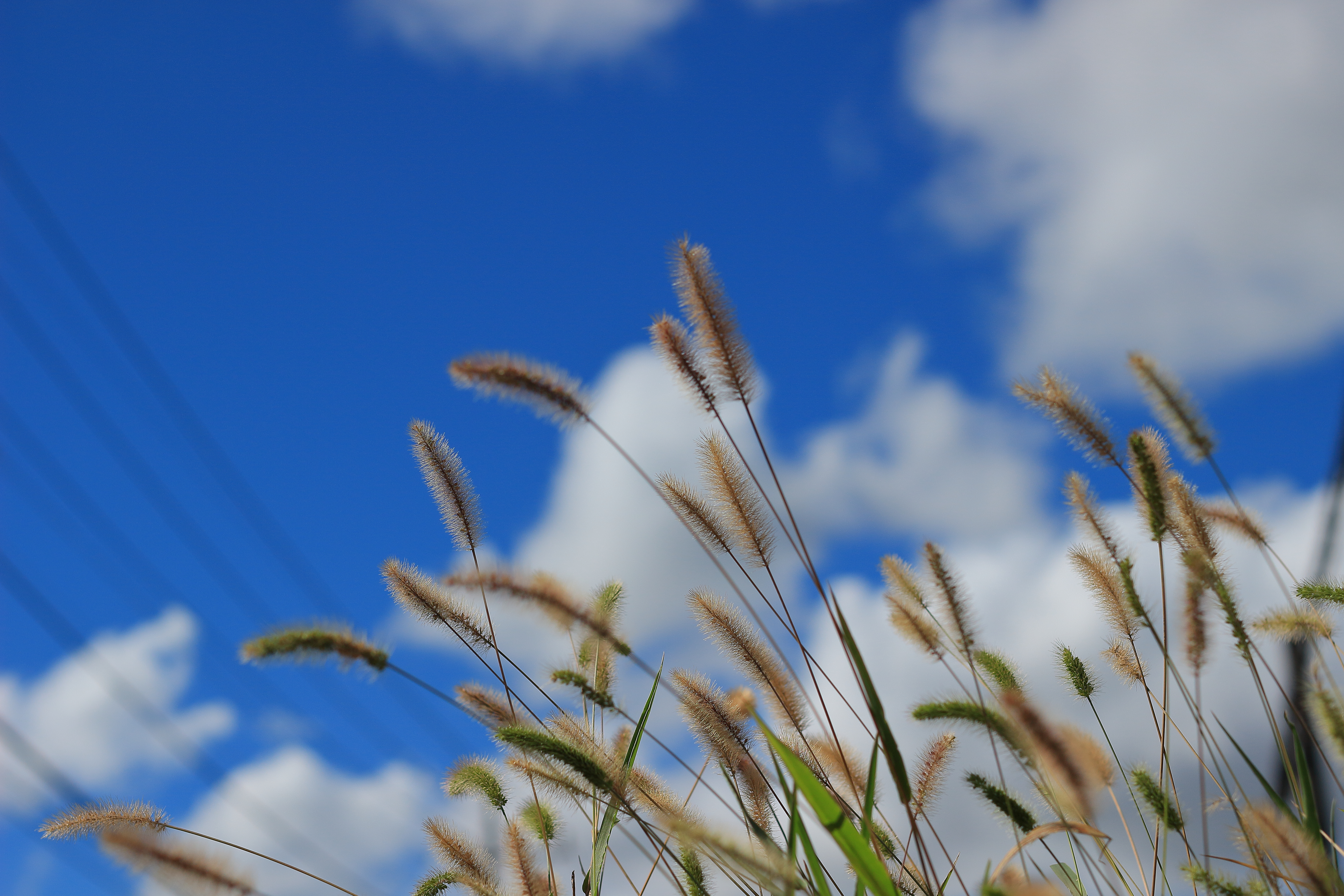 道端に生えるネコジャラシが、そよ風に揺れている様子を写した写真です。背景には澄んだ青空が広がり、穏やかな季節感と平和なのどかさが感じられます。余白のあるコピースペースが、見ている人に癒しと静かな時間を届けてくれる一枚です。