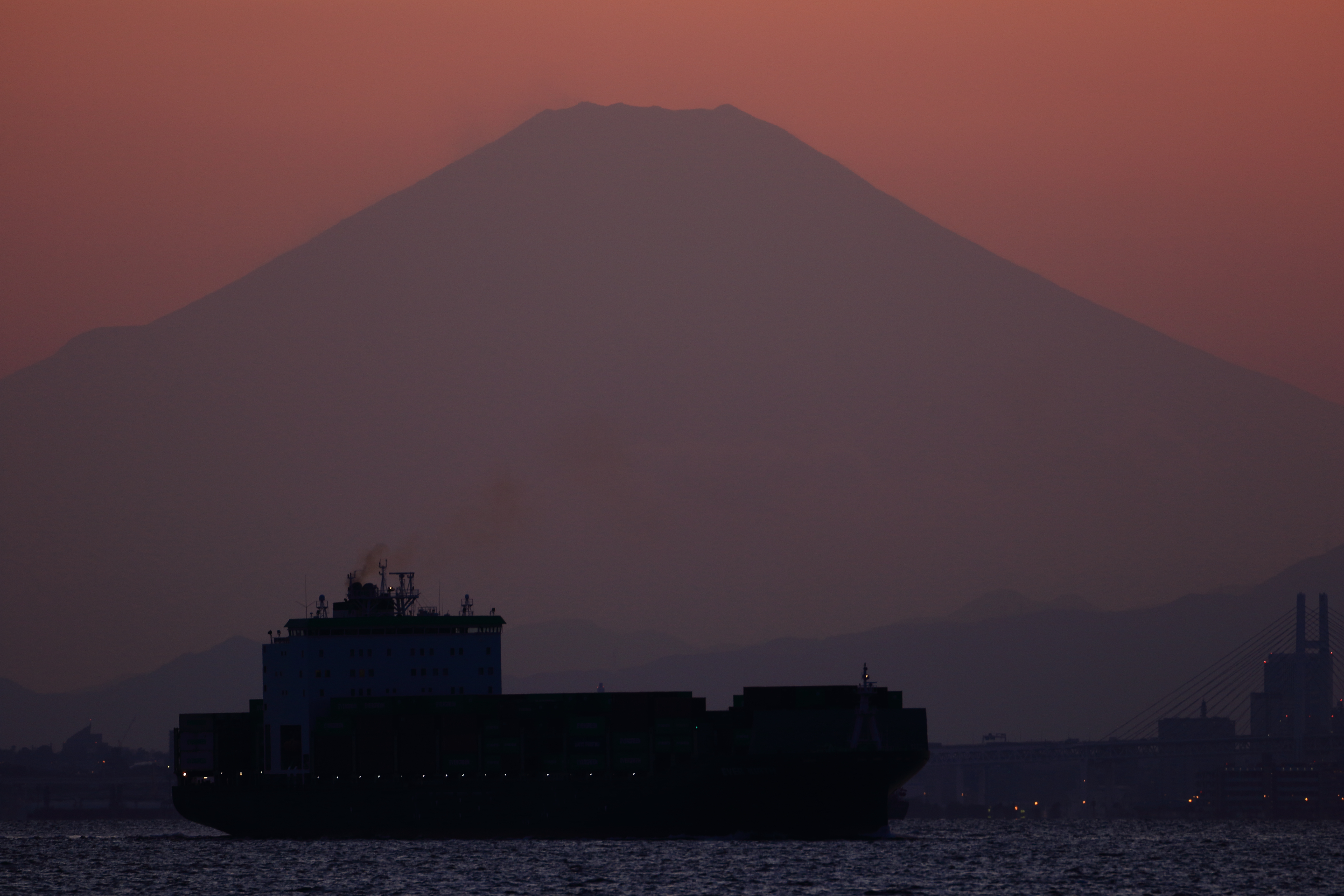 夕焼けに染まる港を背景に、貨物船が大海原へと航海していく様子を捉えた写真です。遠くには日本を象徴する富士山の姿が重なり、静かな中にも力強さを感じさせます。世界中を結ぶ物流や輸出入を担う産業と交通の営みが、雄大な自然と調和して描かれた印象的な一枚です。