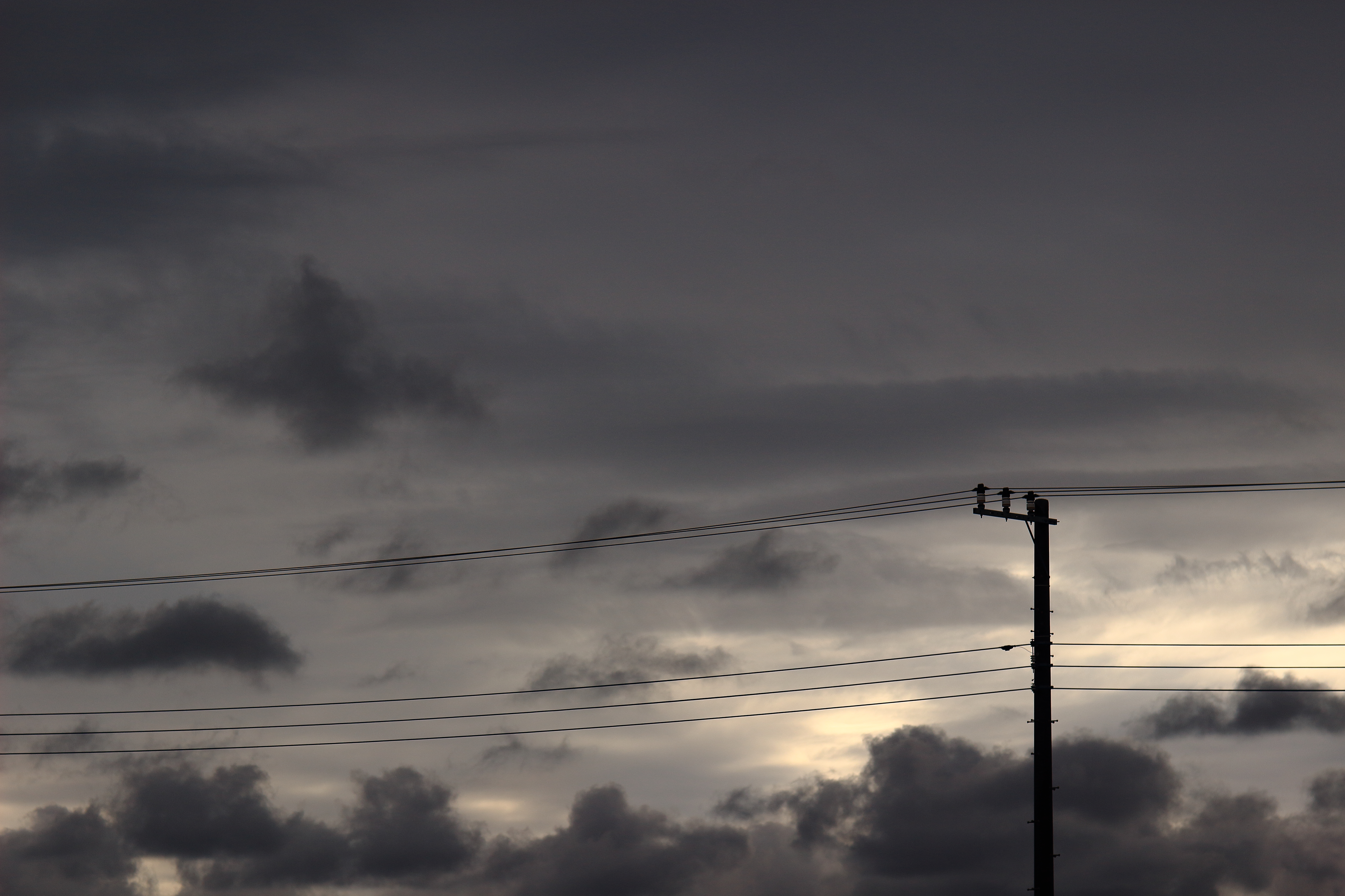 空一面に黒い雲が広がり、雲行きの怪しさを感じさせる写真です。強風にあおられる電線や、雷の気配が漂い、嵐や大荒れの前兆をはっきりと伝えています。広めのコピースペースを用意し、気象の急変に備える必要性を静かに訴えかける、緊張感のある一枚です。