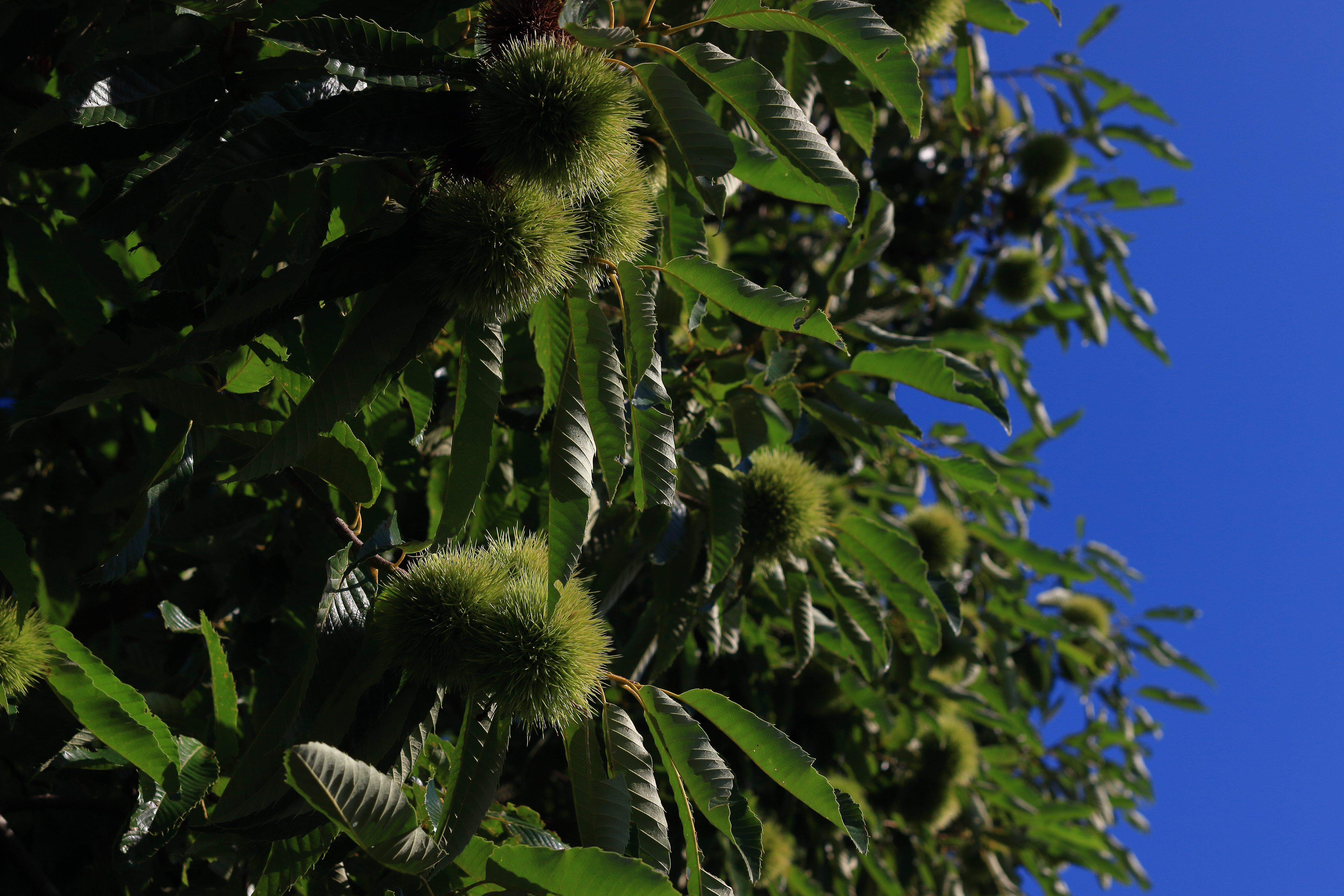 青空の下、木に実った若栗を捉えた写真です。とげとげとした殻が日差しを受けて際立ち、天然の力強さと生命感が伝わってきます。屋外の澄んだ空気の中で、季節の実りが静かに育っていく様子が感じられ、植物が持つ自然の美しさとたくましさを表現しています。