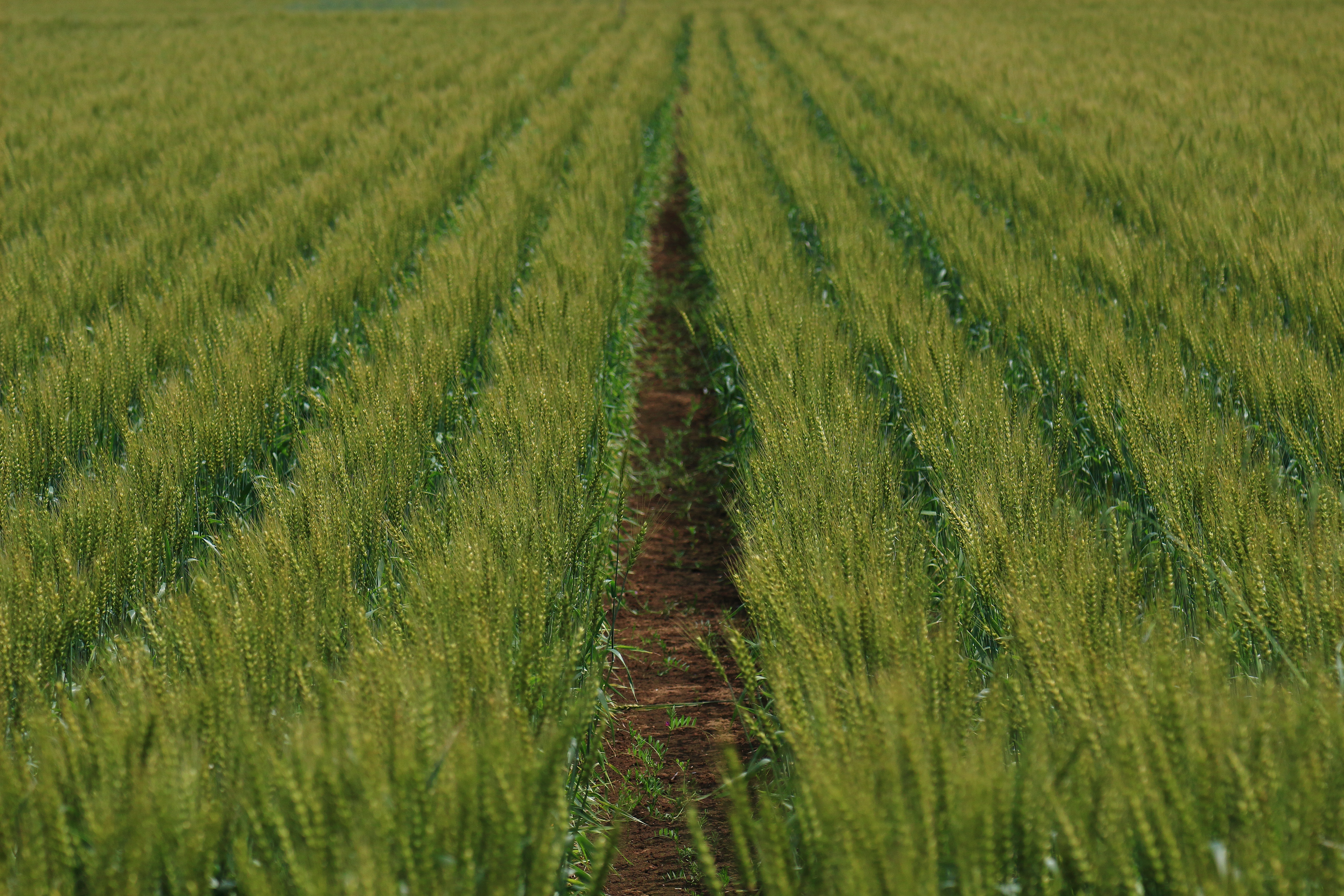 畑に整然と並ぶ農作物が、緑色のストライプ模様を描いている様子を捉えた写真です。土の色とのコントラストが際立ち、規則正しく揃った畝が農業の丁寧さと計画性を感じさせます。統一感のある景観はとても美しく、自然の中に人の営みが調和していることが伝わってきます。整った畑の風景から、豊かな収穫への期待と農作物を育てる努力が表現されています。