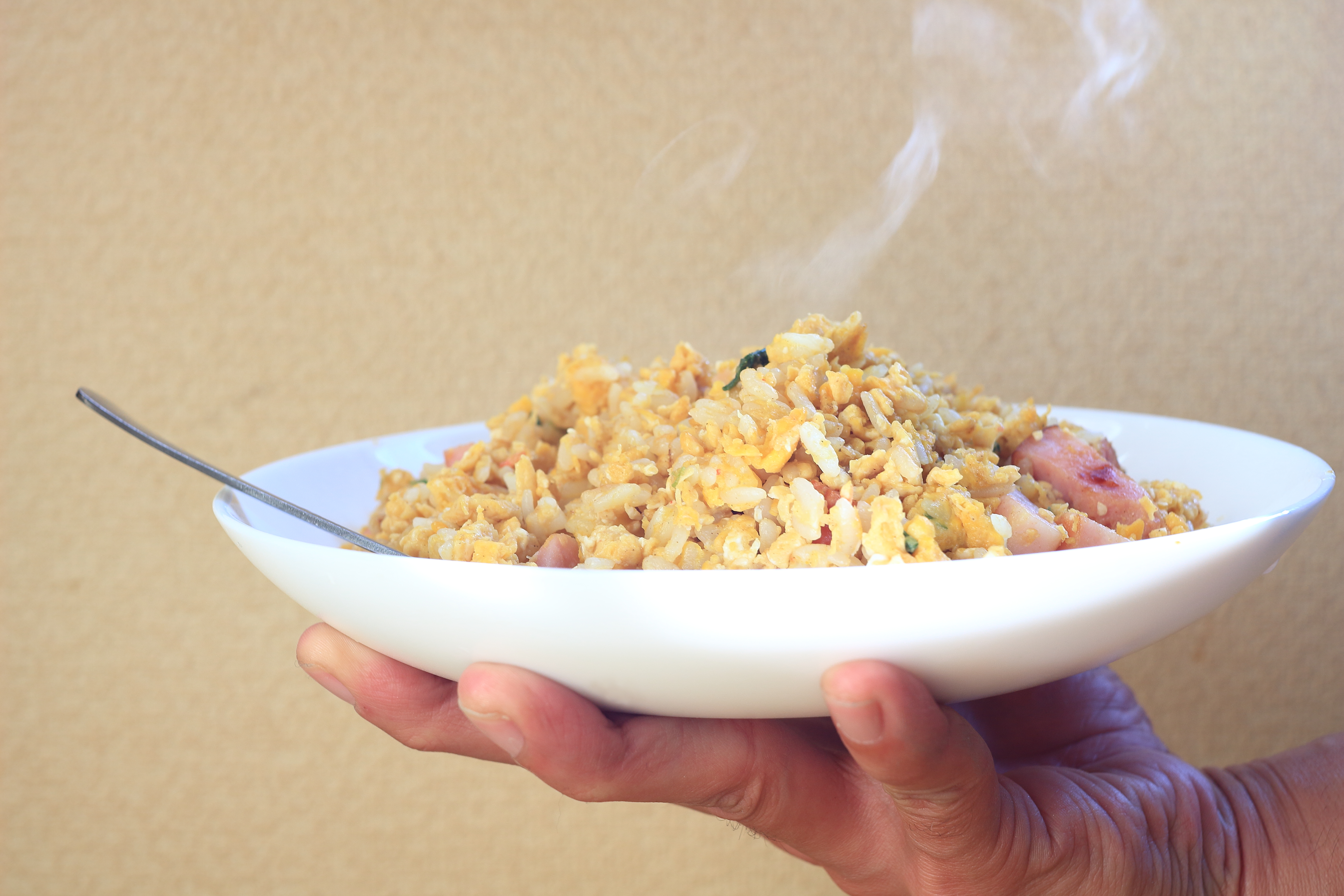 皿に盛り付けられた、できたてのチャーハンを写した写真です。立ちのぼる湯気が、熱々の状態をそのまま伝えています。香ばしく炒められたごはんや具材の色合いが食欲をそそります。自炊ならではの素朴さと温かみが感じられ、出来上がった瞬間の満足感が伝わってきます。手早く仕上げた一皿でありながら、家庭料理の魅力が詰まった写真です。