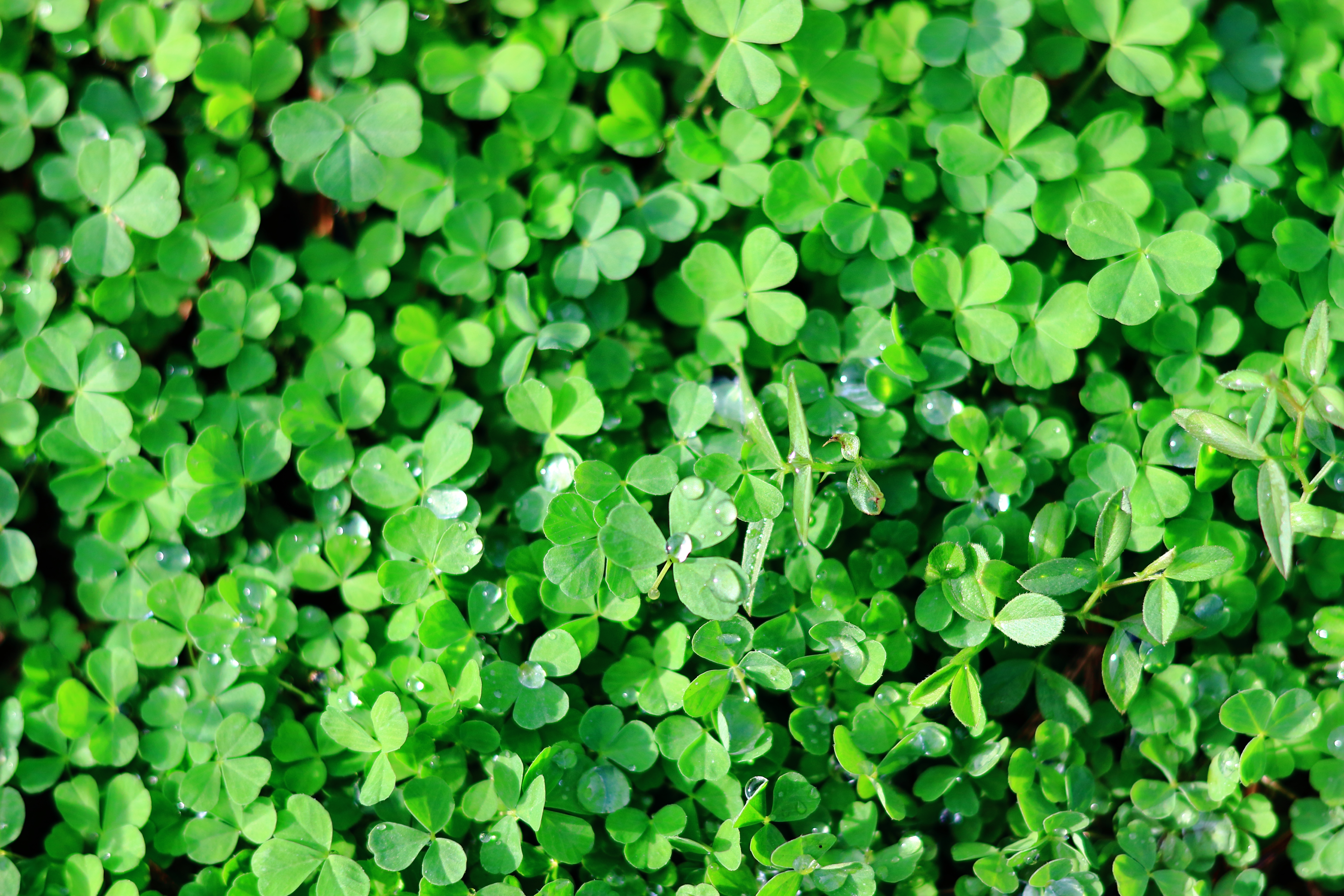 一面に広がるクローバーが、画面全体を鮮やかな緑で満たしています。小さな葉が重なり合い、自然が生み出す繊細な模様を描いています。やわらかな日差しが差し込み、葉の一枚一枚に美しい陰影を与え、明るい部分と深みのある緑との対比が際立っています。光と影のバランスが立体感を生み、野原の静かで穏やかな空気まで感じられます。みずみずしく新鮮な植物の生命力が伝わる、爽やかな印象の写真です。
