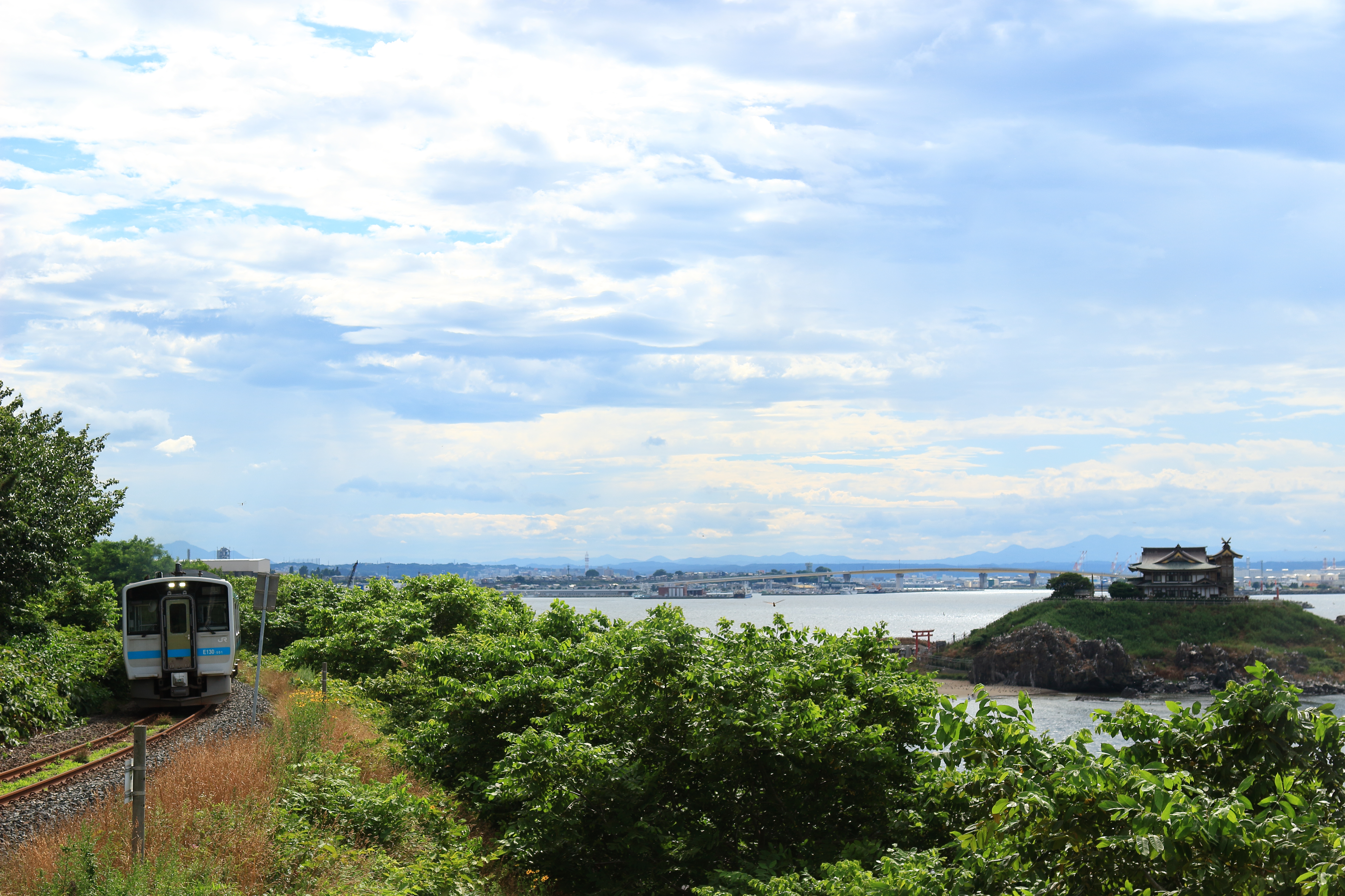 JR八戸線うみねこラインが走る青森県の海岸風景を切り取った写真です。蕪島海浜公園と神社を望む高台からの見晴らしが良く、広がる海岸線が印象的に映し出されています。観光地として親しまれるこのエリアでは、鉄道が大切な交通手段として地域と人を結び、鉄道旅行の楽しさと旅情を感じさせます。海と文化が一体になった交通写真です。