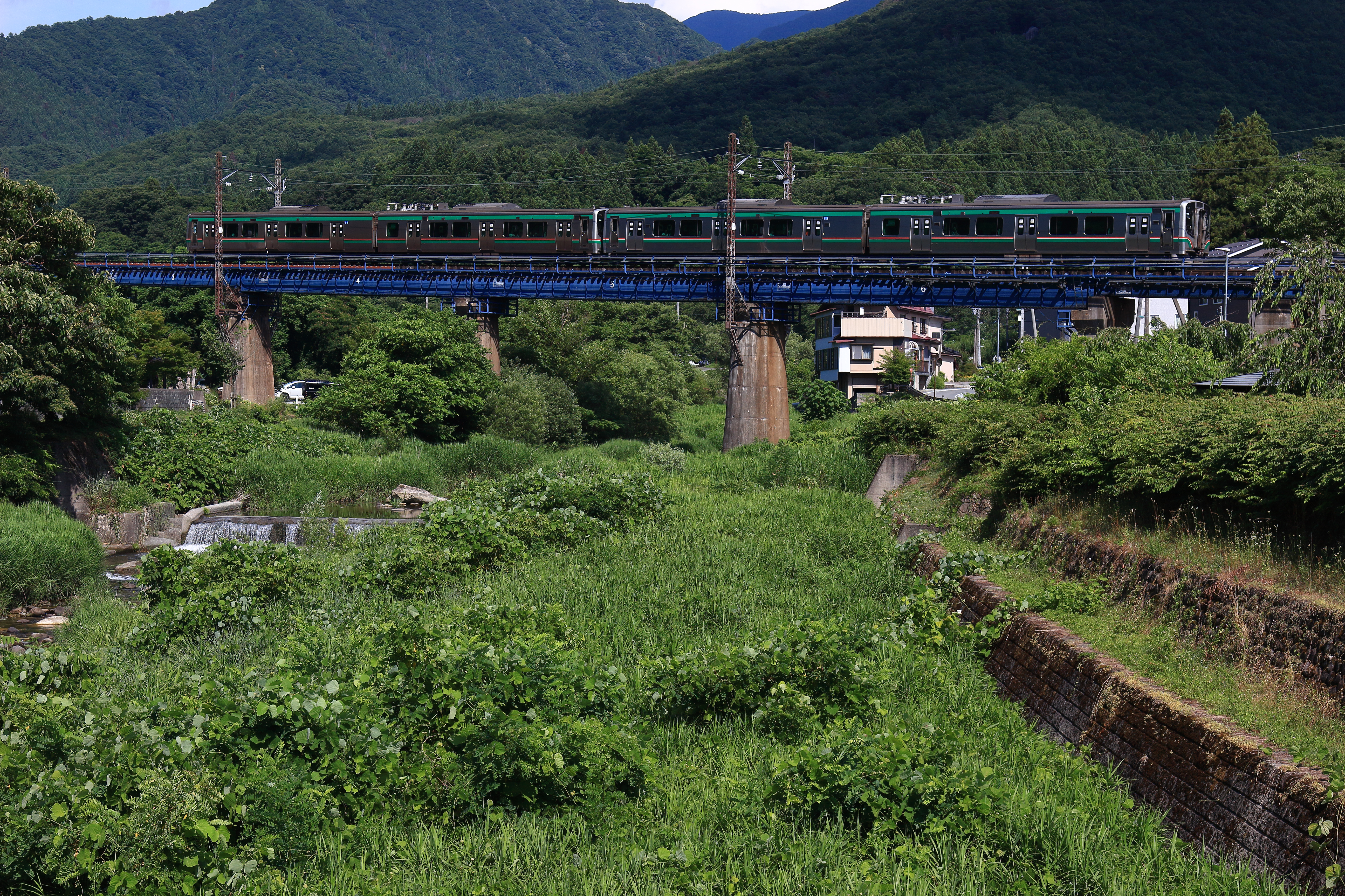 夏の仙山線が立谷川沿いを走り、山寺から面白山高原へと続く風景を切り取った写真です。深い緑に包まれた渓谷と澄んだ川の流れが、東北地方・山形県ならではの爽やかな季節感を伝えています。この地は松尾芭蕉が俳句を詠んだことで知られ、歴史や文化の息づかいを感じさせます。鉄道の旅情と自然、文学が重なり合い、静かに心に残る情景が表現されています。