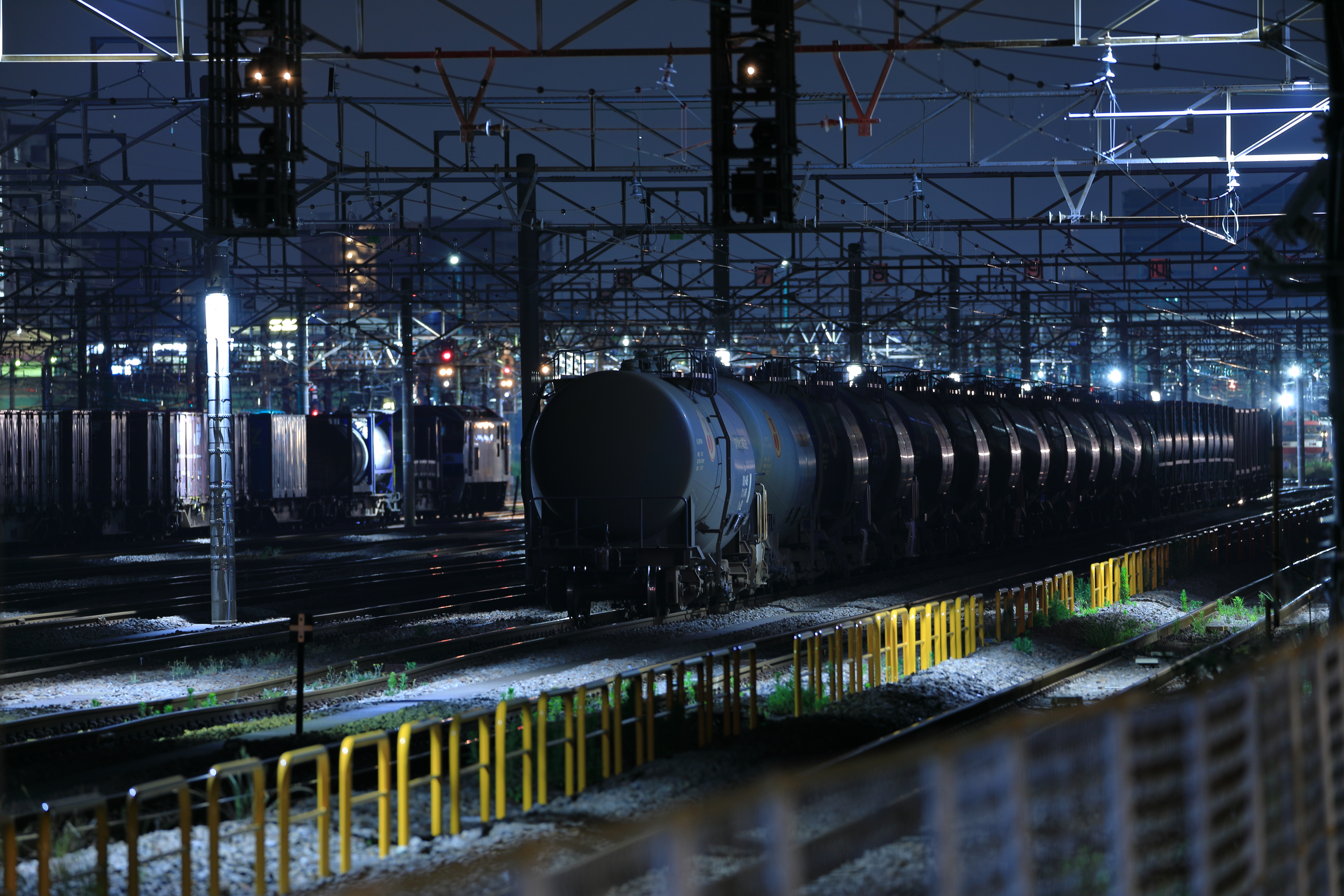 真夜中の操車場に並ぶ貨物列車を捉えた写真です。静寂に包まれた夜景の中、機関車や貨車が規則正しく配置され、日本の物流と産業を支える現場の力強さが感じられます。昼間とは異なる落ち着いた雰囲気の中で、運輸や交通、エネルギーの流れを担う鉄道の重要な役割が印象的に表現されています。
