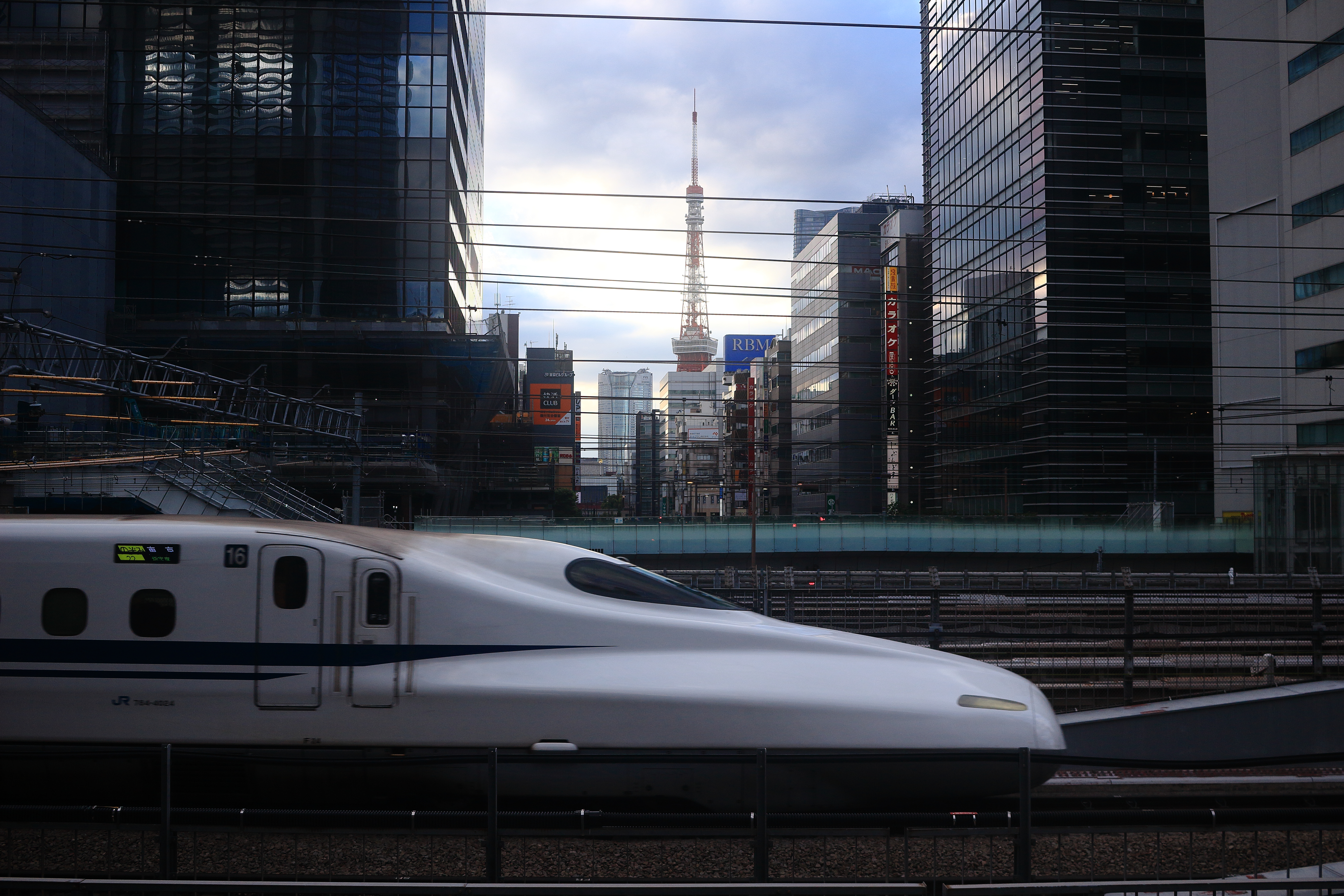 流線型の美しいノーズを誇る東海道新幹線が、浜松町のビルの谷間を縫うように都市風景を横切っていきます。磨き上げられた車体はやわらかな光をまとい、優雅な存在感を放っています。背景には東京タワーがそびえ立ち、近代的な高層ビル群との対比が印象的です。躍動する列車と静かに佇む塔が織りなす一瞬の構図が、東京という都市の力強さと洗練を象徴しているように感じられます。